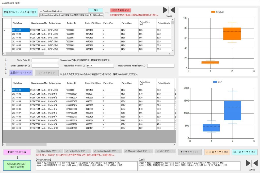 DICOMタグ情報の「Study Description」「Acquisition Protocol」等でフィルタしCTDIvol、DLPを箱ひげ図表示することができます。