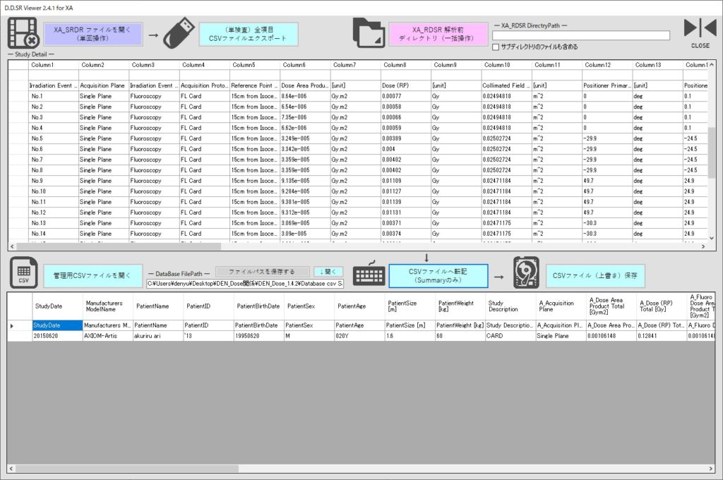 CT、XA装置から出力されたDICOM RDSRから線量管理に必要な項目を抽出し、管理用CSVファイルに転記します。