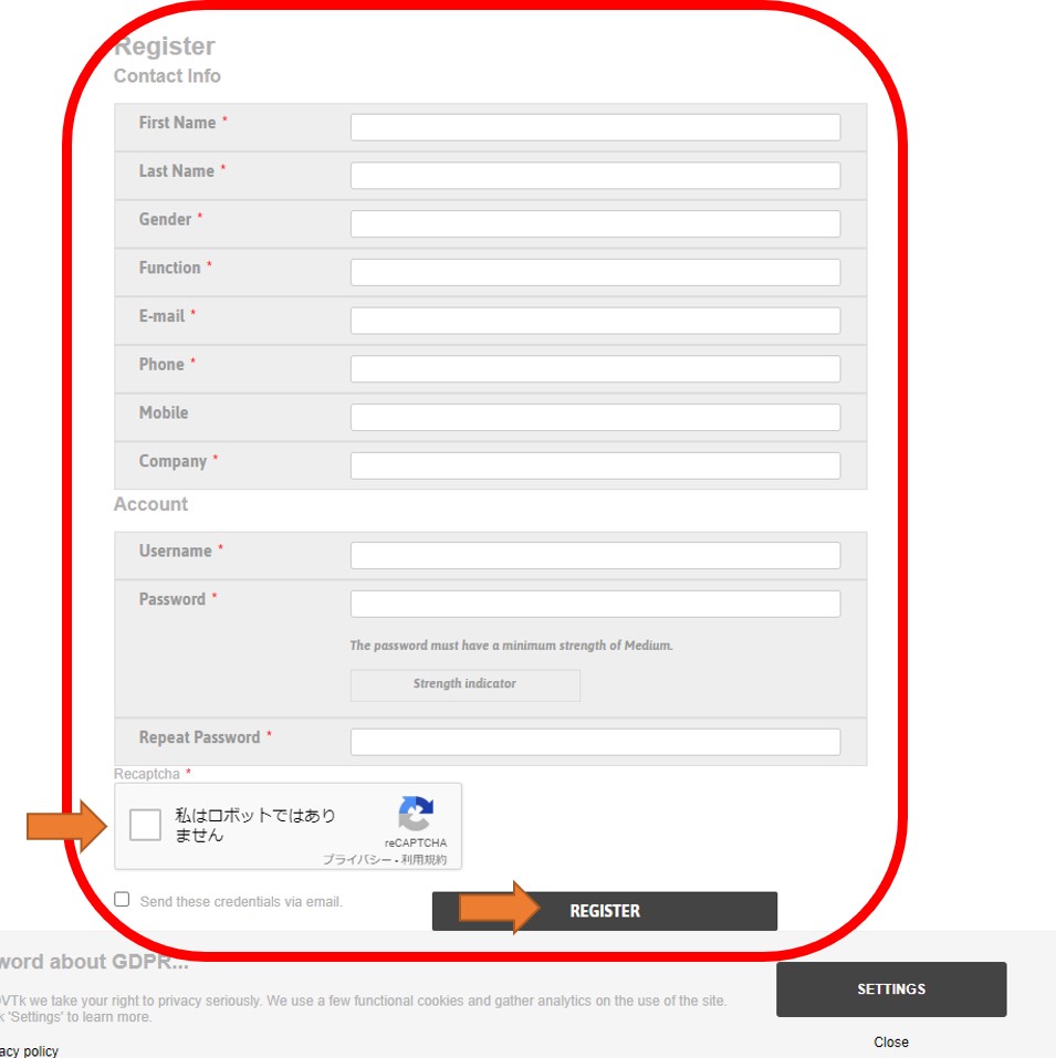 ・必須項目を入力し、reCAPTCHAと「REGISTER」をクリックします。