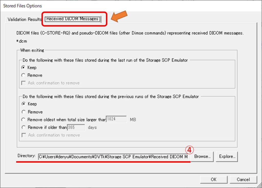 ④[Received DICOM Messages]タブの[Directory]でDICOM送信元から送信されてくるDICOMデータを保存するフォルダを設定できます。