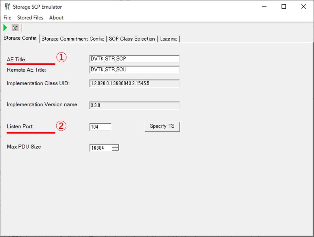 ②はStorage SCP Emulatorがサービスを動かす”部屋番号”になります。これも値は任意ですが、他のサービスで使用していないポート値に設定するようにしてください。0番~1023番はウェルノウンポート番号と呼ばれ使用目的が定められたポート番号であり、デフォルトの104はACR/NEMA DICOM用に割り当てられた番号ですが、同一PCにDICOM通信を行うサービスが混在する場合は、注意してください。