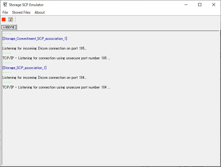 DICOM通信を中断する場合は、左上にある赤色四角の[Stop Emulator]アイコンをクリックします。
