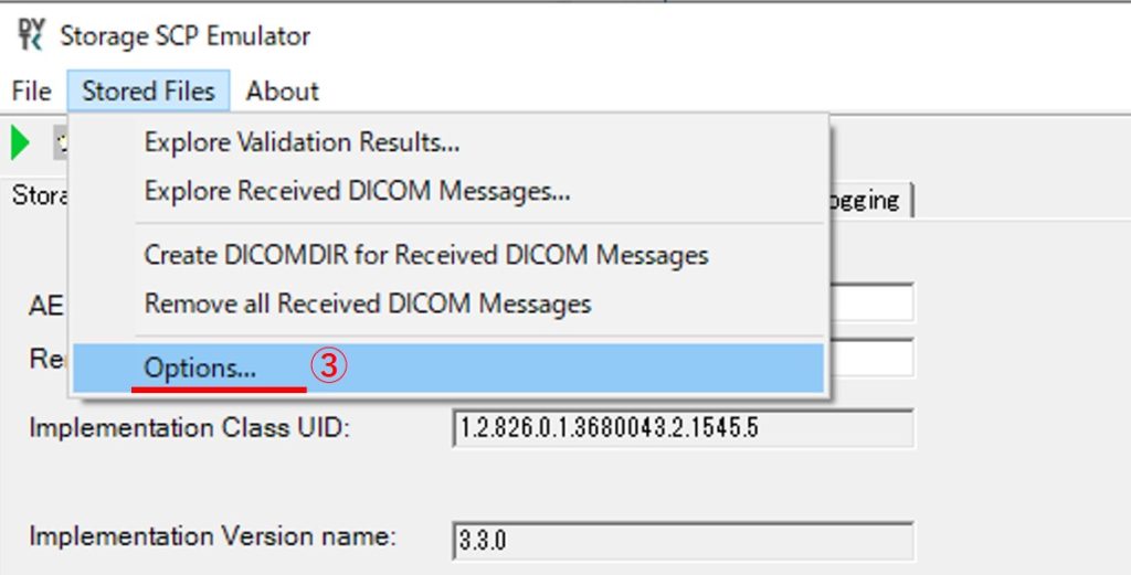 ①がStorage SCP Emulatorが画像を受信するサービスのAE Titleです。(Remote~は今回は扱いません。)特にデフォルトのままで問題ありません。この文字列を、RDSRを送信するためにPACSや検像、CT装置にノードを追加する際に使用します。